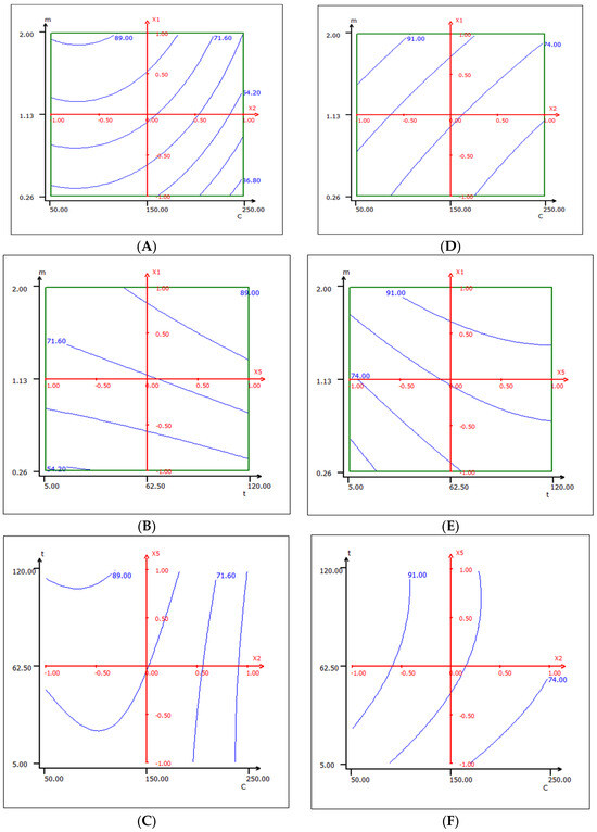 The 2D graphs illustrate the isoreponse curves that show the adsorption rate of Cr (VI) ions onto native cedar (Figure 6A–C) and activated cedar (Figure 6D–F), depending on the level of the parameters. Moving towards areas of low concentration and high values of contact time, it is found that the adsorption rate of Cr (VI) ions increases, while it decreases for the highest concentrations and the lowest contact times.