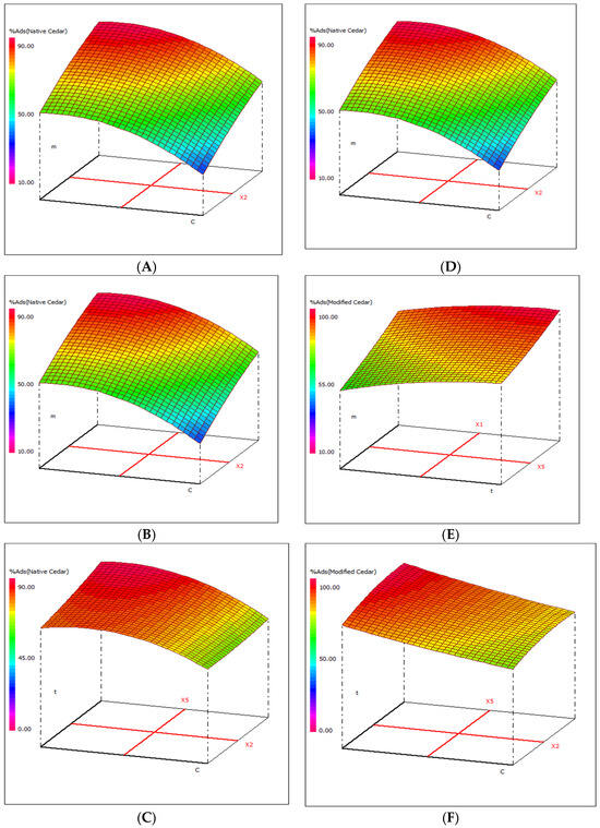 The 3D graphical presentations for the adsorption of Cr (VI) on native cedar (Figure 7A–C) and on activated cedar (Figure 7D–F) reveal response surfaces where the red color expresses the surface with a higher adsorption rate of Cr (VI) ions. It is found that the optimal conditions for reaching maximum adsorption rates are to carry out adsorption, in the case of native Cedar, at high levels (+1) of pH and contact time, and at central levels (0) of adsorbent mass and metal concentration, and in the case of activated cedar, at a high level (+1) of pH and at central levels (0) of adsorbent mass, contact time, and metal concentration.