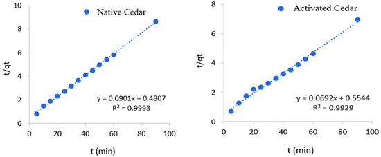 Curves illustrating the pseudo-second-order kinetic model for Cr (VI) adsorption on native and modified cedar sawdust