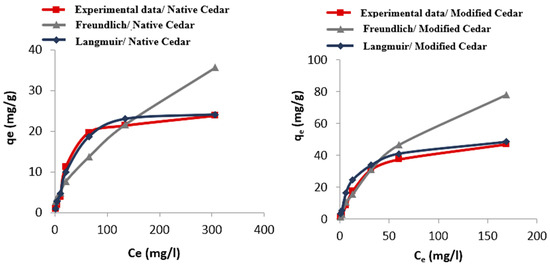 Adsorption isotherms of Cr (VI) on native and modified cedar using Langmuir and Freundlich models.