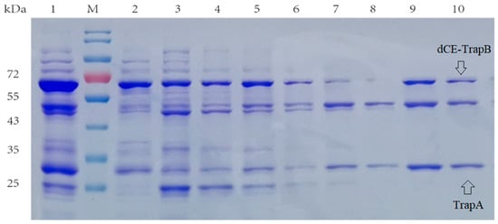 TSase is composed of subunits α and β forming an αββα tetramer structure, so the gene fragment of TSase is also composed of the TrapA gene and the TrapB gene placed in tandem. First, the TrapA gene N end was fused with dCE tags to obtain a series of recombinant plasmids that can express Ectrp-dCE2, Ectrp-dCE7, Ectrp-dCE8, and Ectrp-dCE9, respectively. Protein expression was induced. The cells were disrupted, and the protein was purified. The obtained solutions were subjected to SDS-PAGE for detection.