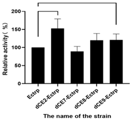 Next, we fused dCE tags to the β subunit to obtain dCE2-Ectrp, dCE7-Ectrp, dCE8-Ectrp, and dCE9-Ectrp. E. coli BL21 was transformed, and protein expression was induced. The cells were disrupted, and the protein was purified. SDS-PAGE was applied to detect the protein’s expression.