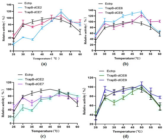 (a): The relative activity of assembled TrapB-dCE2/TrapA, TrapB-dCE7/TrapA, and Ectrp at different temperatures; (b): The relative activity of assembled TrapB-dCE8/TrapA, TrapB-dCE9/TrapA, and Ectrp at different temperatures; (c) After nucleic acid removal, the relative activity of TrapB-dCE2/TrapA, TrapB-dCE7/TrapA with Ectrp at different temperatures; (d) After nucleic acid removal, the relative activity of trapB-dCE8, trapB-dCE9, and Ectrp at different temperatures. All these experiments were performed at pH 9.0.