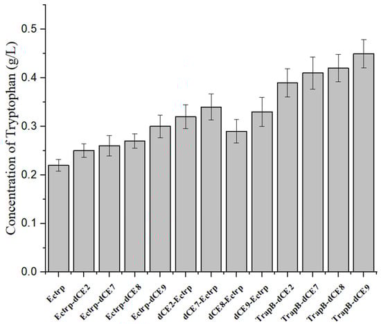The synthesis of L-tryptophan using different dCE-labeled recombinant strains (Ectrp-dCE2, Ectrp-dCE7, Ectrp-dCE8, and Ectrp-dCE9).