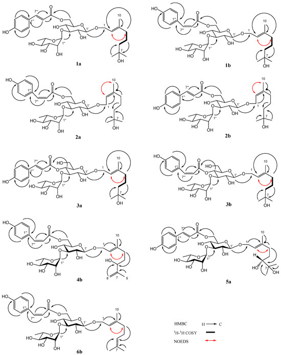 Compound 5 was acquired as a white amorphous powder. Its molecular formula C31H46O14, which contains nine degrees of unsaturation, was affirmed by HRESIMS at m/z 665.2790 [M + Na]+ (calculated for C31H46NaO14, 665.2785). The presence of hydroxy (3375 cm−1), carbonyl (1693 cm−1), double bond (1632 cm−1), and phenyl (1604, 1515, 1448 cm−1) was confirmed with the IR spectrum of 5. Two stereoisomers, 5a and 5b (6:4), were revealed in the NMR spectra of compound 5. The 1H NMR spectrum of 5a (Table 1) affirmed the existence of a trans-p-coumaroyl [δH 6.81, 7.46 (2 H each, d, J = 8.4 Hz), 6.35, 7.64 (1 H each, d, J = 16.0 Hz)], two monosaccharide residues [δH 4.32 (1 H, d, J = 7.6 Hz), 5.17 (1 H, d, J = 2.0 Hz), 1.24 (3 H, d, J = 6.4 Hz)], and a monoterpenoid aglycone [δH 5.41 (1 H, t, J = 7.2 Hz), 4.26, 4.27 (1 H each, d, J = 7.2 Hz), 3.23 (1 H, dd, J = 10.4, 2.0 Hz), 1.33, 1.76, 2.08, 2.29 (1 H each, m), 1.12, 1.16, 1.68 (3 H each, s)]. The 13C NMR spectrum of 5a (Table 2) also indicated the presence of a trans-p-coumaroyl (δC 114.9–169.1), two monosaccharide residues (δC 17.9–102.7), and a monoterpenoid aglycone (δC 16.5–142.5). The above 1H and 13C NMR characteristics of 5a were close to those of (E)-6,7-dihydroxy-3,7-dimethyl-2-octen-1-yl 3-O-(α-l-rhamnopyranosyl)-4-O-(cis-p-coumaroyl)-O-β-d-glucopyranoside (ligurobustoside L) [9], except that the cis-p-coumaroyl in ligurobustoside L was taken in place of a trans-p-coumaroyl at a different position in 5a. The correlation between H-2 of aglycone (δH 5.41) and H-4 of aglycone (δH 2.08, 2.29) was shown in the NOEDS of 5a (Figure 2), suggesting that the C-2 double bond was E-configuration. d-glucose and l-rhamnose, which were confirmed by TLC, were obtained from the acid hydrolysis experiment of compound 5. Moreover, the long-distance correlations between H-1′ of Glc (δH 4.32) and C-1 of aglycone (δC 66.2), between H-1″ of Rha (δH 5.17) and C-3′ of Glc (δC 84.0), and between H-6′ of Glc (δH 4.36, 4.51) and carbonyl of Cou (δC 169.1) were displayed in the HMBC spectrum of 5a (Figure 2). 1H-1H COSY, HSQC, HMBC, and NOEDS (Figure S5) were applied to the assignment of the 1H and 13C NMR signals of 5. Thus, the plane structure of 5a was identified as (E)-6,7-dihydroxy-3,7-dimethyl-2-octen-1-yl 3-O-(α-l-rhamnopyranosyl)-6-O-(trans-p-coumaroyl)-O-β-d-glucopyranoside.