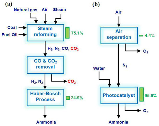 Energy efficiency analysis of (a) the H-B process and (b) photocatalytic nitrogen fixation for NH3 synthesis. The columns and numbers to the right of the block represent the share of the total energy input [4]. Copyright 2018, Cell Press.
