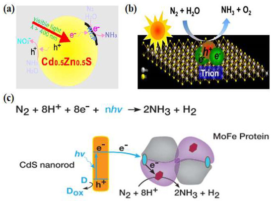 (a) Photocatalytic nitrogen fixation mechanism of Ni2P/Cd0.5Zn0.5S [31]; copyright 2017, Elsevier. (b) Schematic diagram of the exciton-induced multi-electron N2 reduction process [35]; copyright 2017, Elsevier. (c) Catalytic reaction mechanism of CdS: MoFe protein complexes [36]; copyright 2016, Elsevier.