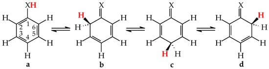 For phenol, the energy of aromatic stabilization is higher than that of prototropy [13], and, consequently, the aromaticity of the ring is a pivotal factor that dictates the higher amount of the enol isomer (hydroxybenzene, a) than the keto ones (cyclohexa-2,4- and -2,5-dienones, b–d; note that b has an identical constitution to d). The experimental tautomeric equilibrium constants for enolization in an aqueous solution for cyclohexa-2,4- and -2,5-dienones (generated by flash photolysis) [14] are almost the same as those estimated theoretically in the gas phase by various quantum-chemical methods [14,15,16,17,18]. Owing to the insignificant amounts of the keto isomers (<10−10%), cyclohexadienones are usually not considered in the structural and acid-base chemistry of neutral phenol. However, in organic chemistry, the keto forms of phenols are frequently used as intermediate structures to explain the mechanism and product(s) formation of various organic reactions such as oxidative metabolism, electrophilic substitution, ionization processes, and the Kolbe-Schmitt and Reimer-Tiemann reactions [12,17,18,19].