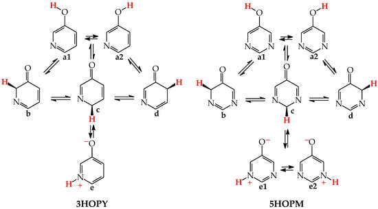 The zwitterionic forms of 3HOPY and 5HOPM have been examined in an aqueous solution and their presence confirmed in experimental UV spectra in 1970 by Kwiatkowski, who applied the Pariser–Parr–Pople calculations for the interpretation of the electronic absorption spectra [73]. However, in a recent article on interesting resonant inelastic X-ray scattering experiments carried out for 3HOPY in an aqueous solution, the authors not only considered the zwitterionic structure e as a prototropic tautomer, but also inappropriately used the name ‘keto tautomer’ for e [74]. In the isomeric mixture of 3HOPY (Figure 3), only the structures b–d refer to the keto forms (CH tautomers), like keto forms of phenol (Figure 1), in which the labile proton is attached to the endo C atoms at the 2-, 4-, and 6-positions vis-à-vis OH. The same is true for isomers of 5HOPM. The two derivatives, 3HOPY and 5HOPM, do not belong to the family of tautomeric aromatic azines. From a prototropy phenomenon point of view, they can be classified in the family of tautomeric phenols. The tautomeric mixture of each of them contains four tautomers, one enol (OH rotamers a1 and a2), and three keto tautomers (CH forms b–d). The endo N atoms do not participate directly in tautomeric conversions. In the gas phase, the zwitterionic forms of 3HOPY and 5HOPM can be neglected [74].