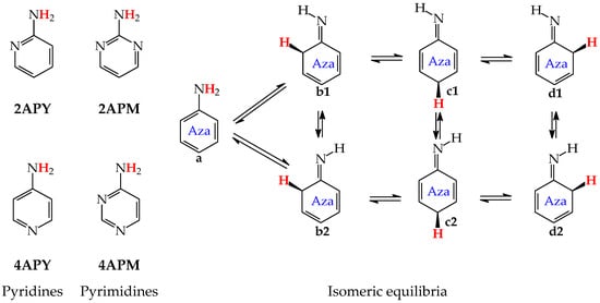 For mono-amino azines (Figure 4), except for prototropic tautomers, we can distinguish, additionally, configurational isomers about the C=NH double bond in the imino forms b–d. This means that at least seven isomers are possible for 2- (2APY) and 4-aminopyridines (4APY), and also for 2- (2APM) and 4-aminopyrimidines (4APM) [58,59,60,61]. For unsymmetrically substituted 2APY and 4APM, the seven isomers possess different constitutions. Intramolecular interactions of the exo = NH group with neighboring endo atoms or groups (N/NH or CH/CH2) possible in the imino forms influence the stability of configurational isomers (1 and 2), and their relative energies and amounts in the isomeric mixtures (see in Section 6). On the other hand, the corresponding isomers b1 and d2, b2 and d1, and also c1 and c2 have identical structures for symmetrically substituted 4APY and 2APM. Hence, in quantum-chemical calculations, seven and four isomers can be considered for unsymmetrically and symmetrically substituted amino azines, respectively.