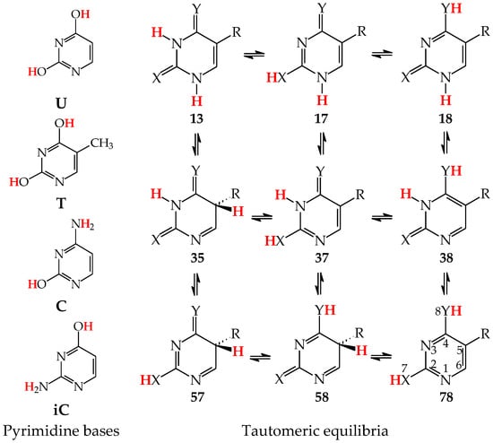 Tautomeric equilibria in pyrimidine bases: uracil (U with X, Y = O, R = H), thymine (T with X, Y = O, R = CH3), cytosine (C with X = O, Y = NH, R = H), and isocytosine (iC with X = NH, Y = O, R = H). The two labile protons indicated in bold red color. The number of atoms shown in 78.