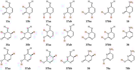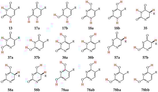 Tautomers of pyrimidine bases possessing the exo –OH and =NH groups display, additionally, two types of isomerism, conformational isomerism about the C–OH single bond and configurational isomerism about the C=NH double bond, respectively, like those of model azines (Figure 2 and Figure 4). The H atoms of these groups can take two extreme positions (syn- and antiperiplanar) vis-à-vis the neighboring endo atoms or groups (N/NH or CH/CH2) and change the stability of isomers due to differences in their intramolecular interactions (see Section 6). In consequence, eighteen tautomers-rotamers can be distinguished for U and T (Figure 6) [48,62,63], and twenty-one isomers for C (Figure 7) [64] and iC (Figure S1, Supplementary Materials) [28,57,65]. Although the tautomeric mixtures of C and iC consist of the same number of tautomers–rotamers (twenty-one), their structures cannot be shown in one common figure, like for U and T. The two exo groups (OH and NH2) in C and iC are placed at different positions, and, thus, the tautomeric structures of 13, 17, 18, 35, 37, 38, 57, 58, and 78 are different. Tautomers-rotamers of C and iC should be presented separately [64,65].