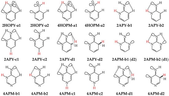 Except for tautomeric conversions, OH tautomers of mono-hydroxy azines exhibit additionally conformational isomerism about the C–OH single bond (Figure 2) [48,49,72]. The possibility of OH-rotation leads to two extreme positions of the hydroxy H atom (syn- and antiperiplanar) vis-à-vis neighboring atoms or groups and to two extreme conformational isomers (1 and 2) of OH tautomer (a). Consequently, five isomers (tautomers–rotamers) can be distinguished for mono-hydroxy azines. For unsymmetrically substituted 2-hydroxypyridine (2HOPY) and 4-hydroxypyrimidine (4HOPM), the five tautomers–rotamers possess different constitutions, whereas for symmetrically substituted 4-hydroxypyridine (4HOPY) and 2-hydroxypyrimidine (2HOPM), the isomers a1 and a2, and also b and d, have identical structures. Thus, five and three tautomers–rotamers, respectively, can be considered in quantum-chemical calculations. The OH-rotamers a1 and a2 of 2HOPY and 4HOPM differ by intramolecular interactions with neighboring atoms or groups (see in Section 6). Consequently, they display different stabilities, different relative energies, and different percentage contents in the isomeric mixtures.