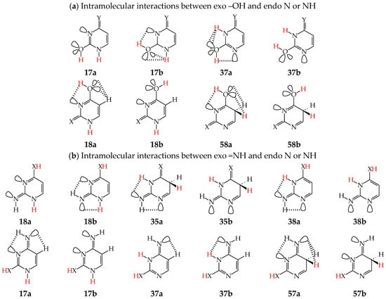 Intramolecular interactions between neighboring exo and endo groups/atoms in selected conformational (a) and configurational (b) isomers of pyrimidine bases (X, Y: O or NH). The labile protons indicated in red color and H atoms engaged in intramolecular interactions in black color.
