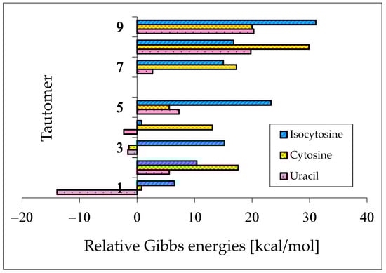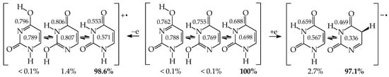 Three tautomers (35, 57, and 58) containing one labile proton at C5 have been usually neglected by chemists even in theoretical investigations on the electron affinity of pyrimidine bases. However, these tautomers play a very important role in ionization processes, particularly when nucleic acid bases gain one excess electron [28,57,63,64,76]. For this reason, all nine possible tautomers have to be analyzed for tautomeric bases to obtain the complete picture on their structures and properties in different isolated states. Investigations performed for selected tautomers, i.e., favored (or canonical) forms detected for neutral bases, lead only to partial results.