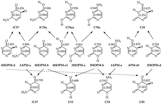 Biomolecules, such as nucleic acid bases, their metabolites, and model compounds, consist of aromatic ring(s) with the exo NH2 and/or OH groups and endo N atoms. They exhibit various types of prototropic equilibria (given in Table 1) that originate mainly from the presence of the exo groups, conjugated with the corresponding endo atoms (N and C) [2,4,5]. In the case of pyrimidine bases (U, T, C, and iC) containing one six-membered ring with two endo N atoms and two exo groups (NH2 and/or OH), two labile protons can move between the conjugated sites according to the analogous scheme of proton-transfers as that given in Figure 1 [28]. For bicyclic purine bases (A and G) and their metabolites (HX, X, and UA) containing the six-membered pyrimidine fragment structurally fused with the five-membered imidazole ring, the imidazole part contains additional labile proton(s) and additional conjugated sites that can also participate in prototropy [29,30,31,32,33,34]. Consequently, the tautomeric equilibria for purine derivatives are more complex than those for pyrimidine bases. For adenine and its model compounds (imidazole, 4APM, and purine), the complete prototropic conversions have been already reviewed [35].