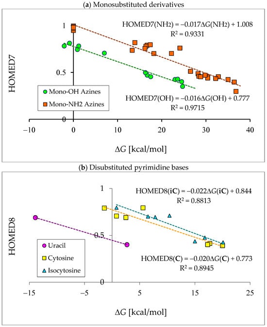 Since tautomeric mixtures of pyrimidine bases and their model compounds contain differently conjugated tautomers, we chose the HOMED index for the quantitative description of electron delocalization which is always in relation with tautomeric conversion(s). To minimize computational errors in these kinds of investigations, the level of theory selected for the HOMED estimations is the same as that for the calculations of ΔGs. The DFT(B3LYP)/6-311+G(d,p) level has been employed for both geometry-optimization and thermochemistry-calculation. For the HOMED determinations, we used the DFT-calculated bond lengths of the title derivatives [18,22,28,49,58,59,60,61,62,63,64,65]. The HOMED values estimated for the neutral and ionized forms are included in Tables S4–S6 (Supplementary Materials).