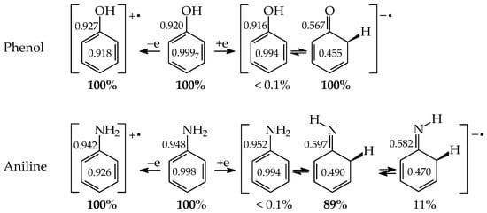 The six-membered aromatic ring is also present in the mono-amino arene—aniline (C6H5NH2). Like C6H5OH, it contains one labile proton and four conjugated sites (Figure 1 for X = NH). However, amino benzene displays the other type of prototropy (enamine-imine tautomerism) compared to phenol [22]. The labile proton can move according to the 1,3-, 1,5, or 1,7-proton shift from the exo NH2 group to the endo C-sp2 atom being at the 2-, 4-, or 6-position vis-à-vis NH2. Four tautomers are thus possible for aniline (a–d, where b and d possess an identical constitution). The aromatic enamino form a dictates the tautomeric preference in aniline. The transfer of the labile proton to the ring C-sp2 and its transformation into C-sp3 strongly changes the delocalization of π-electrons in the imino tautomers b–d, reduces the stability of the ring, and increases the energies of b–d, like for the keto forms of phenol. From a physicochemical point of view, the imino tautomers can be neglected in the tautomeric mixture. They are exceptionally rare isomers of aniline (<10−15% [22]). However, the imine forms are often used as intermediate structures to understand the mechanism of various chemical reactions and to confirm the product formation [19,22,23,24,25,26]. The resonance energy (aromatic stability > 30 kcal mol−1 [27]), being considerably higher than the energy of prototropy in aniline, can only explain the change of isomeric preference when going from simple aliphatic to aromatic enamine-imine tautomeric systems.