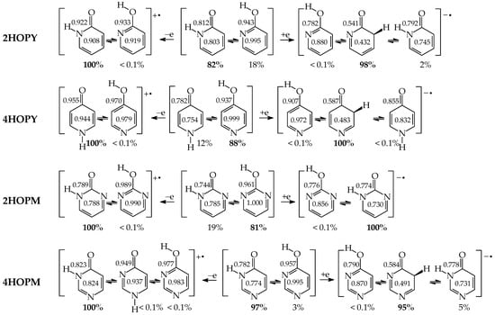 The isomeric mixtures of mono-amino derivatives (2APY, 4APY, 2APM, and 4APM) consist mainly of the aromatic amino forms (a, 100%). The other tautomers can be neglected for neutral derivatives in their ground states (<1 ppm). An exception is a photo-induced tautomeric conversion. The reversible amino-imino prototropic equilibria have been observed experimentally between 2APY-a and 2APY-b in a low-temperature argon matrix IR spectra upon UV irradiation [79]. A different situation takes place for neutral mono-hydroxy derivatives (2HOPY, 4HOPY, 2HOPM, and 4HOPM), for which at least two tautomers, OH (conformation a1) and NH, can be detected in their ground states (Table 5). The differences in composition of the isomeric mixtures of mono-hydroxy and mono-amino aromatic azines confirm different acid-base properties of the keto-enol, imine-enamine, amide-iminol, and imine-amine (amidine) tautomeric moieties resulting from the different electronegativity of C, N, and O atoms, as well as from internal effects, particularly intramolecular interactions and push–pull electronic effects between tautomeric groups, and also electron delocalization in the isomeric systems [2,4,13,27,49,58,59,60,61].