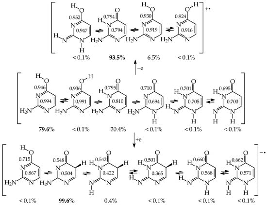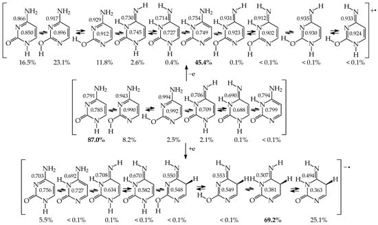 Prototropic conversions in aromatic heterocompounds, including nucleic acid bases, have been reviewed by Katritzky (died in 2014) and his co-workers in the 1960–2010 period (see, for example, refs. [4,5]). They compiled experimental and computational results mainly for favored tautomers (percentage contents > 1%), and considered most minor (<1%) and all rare tautomers (<0.01%) as negligible in tautomeric mixtures. This kind of treatment of tautomeric systems has led to some discrepancies in the literature, particularly for ionized, protonated, and deprotonated forms, for which prototropy has been usually neglected. Experimental and/or theoretical investigations have been carried out for tautomers that are favored in neutral isomeric mixtures. In the case of pyrimidine nucleic acid bases, the canonical forms or their major tautomers (two or three structures) have been the most frequently considered. These kinds of investigations for the selected isomers are usually partial. Only in the last twenty years have the complete tautomeric equilibria been taken into account for nucleic acid bases, and stabilities of all possible tautomers–rotamers in their various oxidation states (neutral, oxidized, and reduced) analyzed.