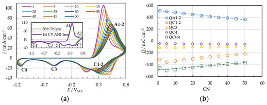 The peak current density jp corresponding to anodic and cathodic processes linearly increases with increasing CN during the polymerization process in both potential regions. Figure 1c shows the dependence of jp on CN for 25 cycles scanned within the region of −1.2–0.8 VSCE after the initiation step of 5 cycles. The slope djp,A/dCN is indicative of the ANI polymerization rate, since CN can be considered as a measure of the polymerization time. It was found that djp,A/dCN = 3.5 mA cm−2 per cycle number.