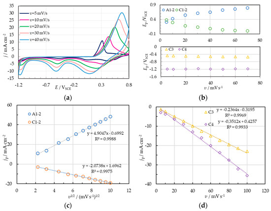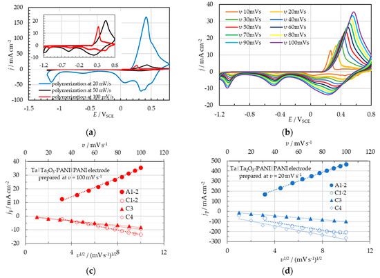 The effect of υ on the redox processes was examined for all electrodes prepared at different scan rates, as shown above for υ = 50 mV s−1 (Figure 3a). Figure 7b depicts examples of CVs obtained at different scan rates for the Ta|Ta2O5-PANI|PANI electrode prepared at υ = 100 mV s−1. As for electrodes prepared at υ = 50 mV s−1, in the case of electrodes prepared at a higher scan rate, namely υ = 100 mV s−1 (Figure 7c), and a lower one, namely υ = 20 mV s−1 (Figure 7d), a linear relationship is found between jp and υ1/2 for the peak A1–2 and its counterpart C1–2, as well as between jp and υ for peaks C3 and C4.