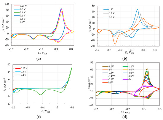 - When Eupper > 0.9 VSCE, peaks C1 and C2 gradually merged into a single peak that shifted toward lower potentials. Eventually, at Eupper = 1.5 VSCE, the single cathodic peak originating from the combination of peaks C1 and C2 merged with C3, whereas peak C4 remained unaffected (Figure 4b).