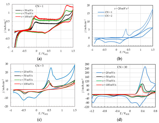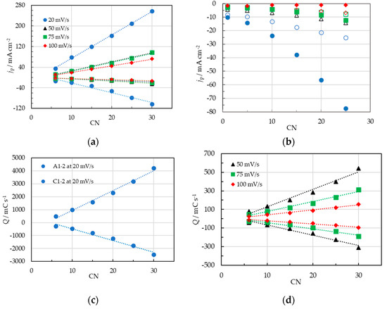 A linear jp = f(CN) curve was also observed for peaks C3 and C4 for υ > 20 mV s−1. At υ = 20 mV s−1, the jp = f(CN) curve deviates from linearity, as, at this scan rate and lower ones, there is an enormous increase in jp compared to that observed at higher υ. This is better reflected in the charge density Q included under the CV corresponding to the peak A1–2, which is almost eight times higher (Figure 6c) than that observed at υ = 50 mV s−1 (Figure 6d), and hence the corresponding electrodeposition rate (Table 1).