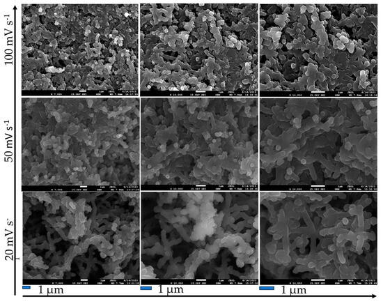 Several parameters, such as the electrode substrate, the potential scan rate and the potential window, as well as the sulfuric acid and ANI concentrations from which the PANI synthesis was carried out using cyclic voltammetry, were found to affect the morphology, along with other properties of the deposited PANI [2,17,35,36,37,38,39,40]. Examples of SEM images taken for the Ta2O5-PANI|PANI films deposited on Ta using cyclic voltammetry at υ = 20, 50 and 100 mV s−1 from 1.0 M H2SO4 solution containing 0.2 M ANI are illustrated in Figure 8.