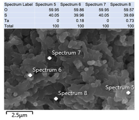 EDS analysis corresponding to the SEM image of the Ta2O5-PANI|PANI film prepared via cyclic voltammetry at υ = 50 mV s−1 (for details, see Figure 8).