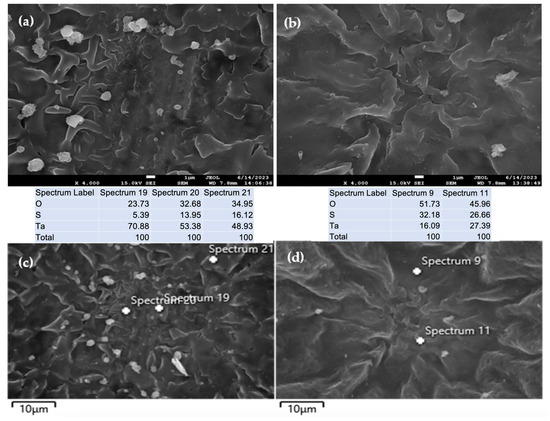 SEM images and corresponding EDS analysis of the Ta2O5-PANI composite films prepared via cyclic voltammetry at υ = 50 mV s−1 (for more details, see Figure 8) after removing the outermost PANI layer at the early (a,c) and late (b,d) stages of the polymerization process.