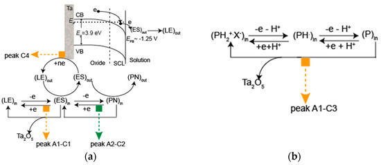 As a direct electron transfer from the Ta substrate to the PANI outer layer may be prevented due to the semiconducting character of the oxide layer [47], it is plausible to suggest that the electroreduction would be facilitated close to the flat-band potential EFB~−1.25 VSCE of Ta2O5, where peak C4 is located due to the bending of the conduction band (CB) and the valence band (VB) that lead to an electron accumulation layer across the oxide [48], as shown in Figure 12a. Indeed, the results of this study, combined with those reported for TiO2 and Nb2O5, support such a correlation, as the EFB for both metal oxides being around −0.35 VSCE differs remarkably from that of Ta2O5. This difference implies that the presence of peak C3 in the case of Ti and Nb substrates originates from both the phenazine moiety and the semiconducting properties of Nb2O5 and TiO2. In the case of the Ta substrate, distinct peaks appear for these processes, namely peak C3 for phenazine derivatives and peak C4 located at ~−1.25 VSCE, adjacent to the EFB of Ta2O5 for the reduction of (LE)out (Figure 12a). The observation of the cathodic peak C4 is discussed for the first time in this study, and additional research is underway to provide further evidence supporting the co-deposition mechanism of oxide and PANI or other CPs on valve metal substrates.