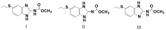 Since 1991, numerous attempts have been made to improve albendazole’s solubility and thereby enhance its efficacy, such as the use of soybean oil emulsion [6], surfactants [7], liposomes [8], polyvinylpyrrolidone [9], ionization in acids [10], and complexations with cyclodextrins. Among these methods, complexation with cyclodextrins is better than the others, since albendazole presents three tautomeric forms, I, II, and III, as shown in Figure 1 [11]. Cyclodextrins can form inclusion complexes with them to prevent their interconversion. Forms I and II are enantiomerically related forms [12], and the commercially available form I is metastable at room temperature while form II is stable. Therefore, complexation with cyclodextrins can not only increase solubility, but also stabilize the compounds [13].