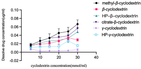 Extra albendazole was added to the solutions of β-cyclodextrin, HP-β-cyclodextrin, methyl β-cyclodextrin, HP-γ-cyclodextrin γ-cyclodextrin, and citrate-β-cyclodextrin in water with different concentrations (5, 10, 15, 20, 25, and 30 mmol/mL). After stirring at room temperature for 48 h, each mixture was filtered, diluted with water, and checked using HPLC; the results are summarized in Figure 2. It was found that methyl-β-cyclodextrin had the best solubilization effect on albendazole, and the linear relationship between albendazole and methyl-β-cyclodextrin was classified as AL type according to Higuchi and Connors’s description [48].