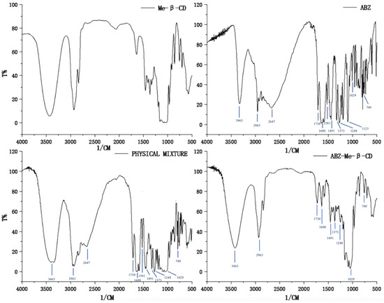 FTIR spectra were used to confirm the complex of albendazole with random methyl-β-cyclodextrin. The FTIR spectra of methyl-β-cyclodextrin, albendazole, the physical mixture of albendazole and methyl-β-cyclodextrin, and their inclusion complex are shown in Figure 3. Compared to the spectrum of methyl-β-cyclodextrin, the characteristic peaks of albendazole appeared at 3463 cm−1 (N-H stretching in carbamate), 2963 cm−1 (C-H aliphatic stretching vibration), 2647 cm−1 (-NH intramolecular in imidazole), 1730 cm−1 (bending vibration of C=O bond in carbamate), 1600 cm−1 (C=C aromatic and N-H out of the plane bending in benzimidazole), 1581 cm−1 (stretching vibration of C=N group), 1491 cm−1 and 1373 cm−1 (C-N and C-O stretching vibrations), 1248 cm−1, 1123 cm−1, and 1029 cm−1 (CH and NH in plane bending vibrations and CH deformation), and 1000–600 cm−1 (skeletal vibrations, CH out of plane bending, NH2 rocking, and C-S stretching vibrations), and they are obviously seen in the physical mixture of albendazole and methyl-β-cyclodextrin, but are slightly reduced in the inclusion complex. These changes in the characteristic peaks of albendazole confirmed that the albendazole was complexed with cyclodextrin.