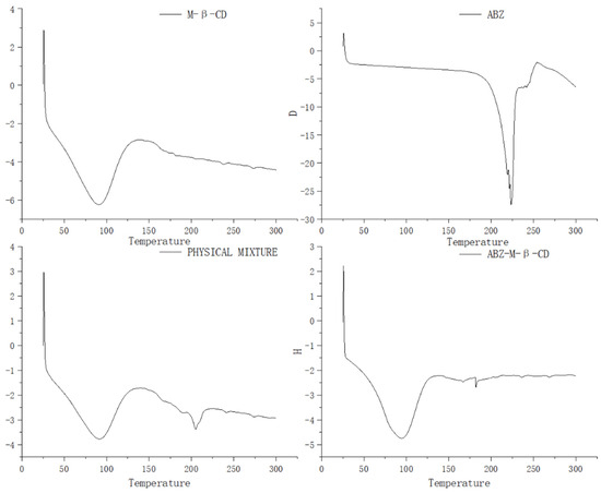 The differential scanning calorimetry curves of albendazole, methyl-β-cyclodextrin, their mixture, and inclusion compound were recorded on a DSC 214 differential scanning calorimeter (from Netzsch, Bobingen, Germany) by placing them in an aluminum crucible, heating at a rate of 10 °C/min in the scan range from 25 to 300 °C under a nitrogen atmosphere (150 mL/min). Al2O3 was used as a reference.