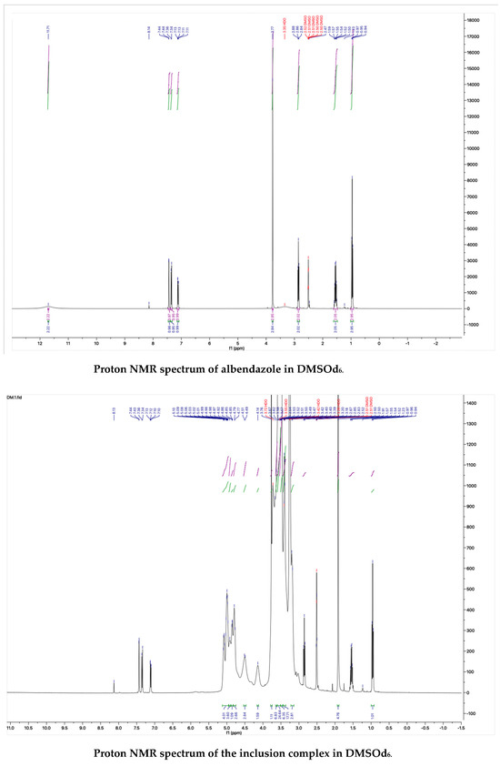 When albendazole was treated with 40% of HP-β-cyclodextrin, sulfobutylether-β-cyclodextrin, or methyl-β-cyclodextrin in water, its aqueous solubility was remarkably increased from 0.2 μg/mL to 0.79 mg/mL, 1.17 mg/mL, and 1.52 mg/mL, respectively, and these increased water solubilities were confirmed by proton NMR spectra in D2O [28,29,30].