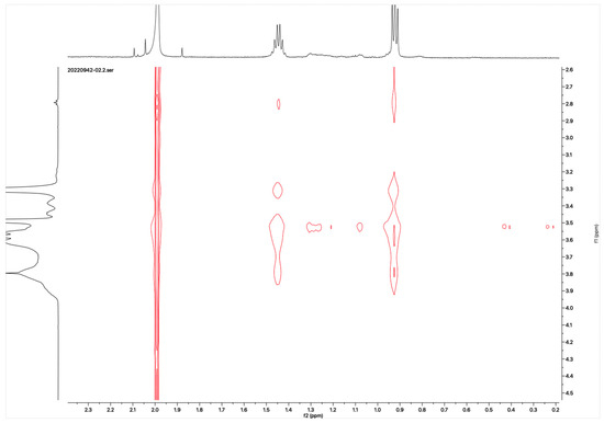 The proton NMR spectra of albendazole in DMSOd6, methyl-β-cyclodextrin in D2O, and the inclusion complex in D2O and DMSOd6 are shown in Figure 5. The proton NMR spectrum of the complex in D2O exhibited the signals from albendazole at 7.61 (1H, s), 7.56 (1H, d, J1 = 8.0 Hz), 7.33 (1H, d, J1 = 8.0 Hz), 2.91 (2H, t, J1 = 8.0 Hz), 1.54 (2H, m), and 1.06 (3H, t, J1 = 8.0). The signals of OCH3 overlapped with the signals from methyl-β-cyclodextrin in the range from 4.00 ppm to 3.50 ppm. The proton NMR spectrum of albendazole in DMSOd6 exhibited signals at 7.46 (1H, s), 7.34 (1H, d, J1 = 8.0 Hz), 7.11 (1H, d, J1 = 8.0 Hz), 3.76 (3H, s, OCH3), 2.85 (2H, d, J1 = 8.0 Hz), 1.53 (2H, d, J1 = 8.0 Hz), and 0.95 (3H, d, J1 = 8.0 Hz); the proton NMR data of albendazole in the complex in DMSOd6 exhibited signals at 7.42 (1H, s), 7.34 (2H, d, J1 = 8.0 Hz), 7.10 (2H, d, J1= 8.0 Hz), 2.65 (2H, d, J1 = 8.0 Hz), 1.54 (2H, d, J1 = 8.0 Hz), and 0.95 (3H, d, J1 = 8.0 Hz). The chemical shift difference in the signals of albendazole in DMSOd6 between the complex and the drug alone could not support the formation of the inclusion complex. The Roesy spectrum of the inclusion complex in D2O was recorded (Figure 6). The signals from the three aromatic protons, two methylene, and one methyl protons showed the interactions with methyl-β-cyclodextrin, which confirmed the formation of the inclusion complex.
