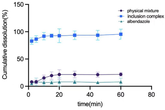 The dissolution curves of albendazole, the physical mixture of albendazole and methyl-β-cyclodextrin, and their inclusion complex.