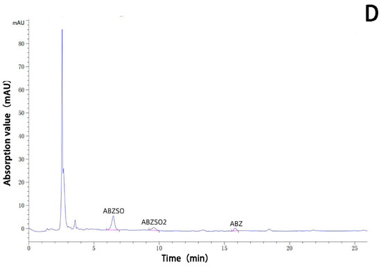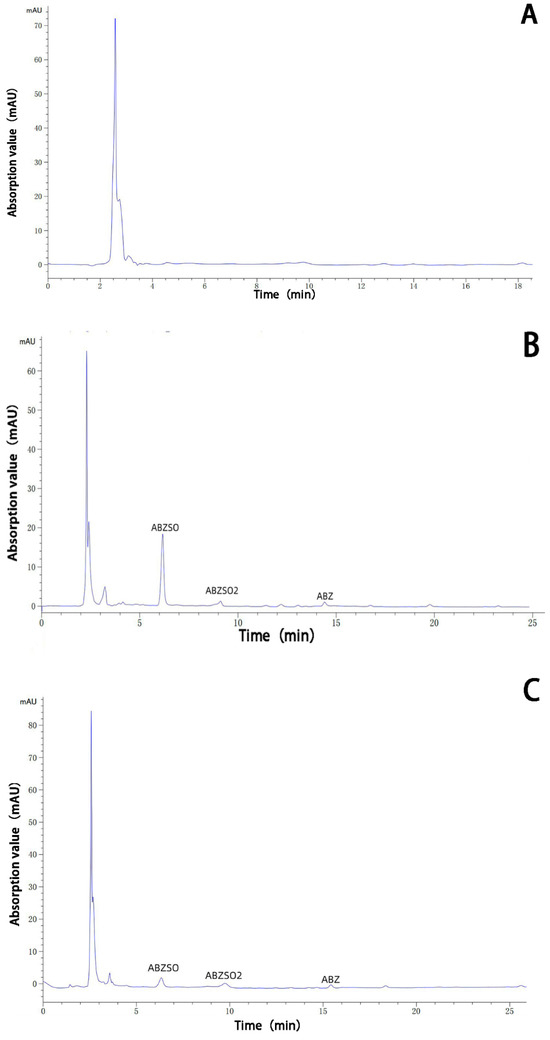 The albendazole, albendazole sulfoxide, and albendazole sulfone in blank dog plasma and the blank dog plasma were analyzed using HPLC and are shown in Figure 10. Under the HPLC conditions we used, the blank dog plasma did not interfere with the detection of albendazole, albendazole sulfoxide, and albendazole sulfone in the dog’s plasma.