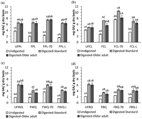 Total phenol content (mg gallic acid/g dry basis) in Pardina (a), Castellana lentil (b), white (c), and black quinoa (d) for unfermented flour (UFPL, UFCL, UFWQ, and UFBQ), fermented grain/seed (FPL, FCL, FWQ, and FBQ), fermented dried at 70 °C (FPL-70, FCL-70, FWQ-70, and FBQ-70), and fermented lyophilised (FPL-L, FCL-L, FWQ-L, and FBQ-L) flour obtained with a standard or older adult in vitro digestion model. a,b,c,d Different lowercase letters indicate significant differences (p < 0.05) between samples. A,B,C Different capital letters indicate significant differences (p < 0.05) between digestion models.