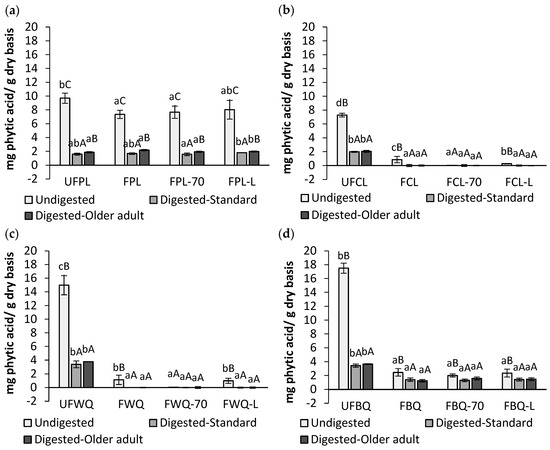 Phytic acid content (mg/g dry basis) in Pardina lentil (a) and Castellana lentil (b) and white (c) and black quinoa (d) for unfermented flour (UFPL, UFCL, UFWQ, and UFBQ), fermented grain/seed (FPL, FCL, FWQ, and FBQ), fermented dried at 70 °C (FPL-70, FCL-70, FWQ-70, and FBQ-70), and fermented lyophilised (FPL-L, FCL-L, FWQ-L, and FBQ-L) flour obtained with a standard and older adult in vitro digestion model. a,b,c Different lowercase letters indicate significant differences (p < 0.05) between samples. A,B,C Different capital letters indicate significant differences (p < 0.05) between digestion models.