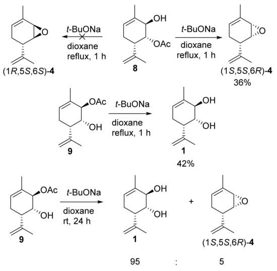 As summarized in Table 1, both the reaction duration and the molar ratio of reagents greatly influenced the yield of epoxide (1S,5S,6R)-4. The formation of the mixture of monoacetates 8 and 9 was observed as the amount of t-BuONa decreased. The results showed that the 4:1 molar ratio of reagents (t-BuONa: diacetate 6) and the reaction duration of 1.5 h could provide a better yield (81%, entry 1).