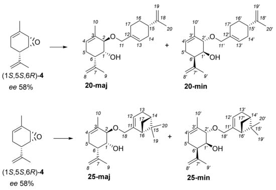 Since we used (1S,5S,6R)-4, synthesized from (−)-verbenone with an enantiomeric excess of 58%, products 20 and 25 were isolated as mixtures of two diastereomers in the case of perillyl alcohol and myrtenol containing asymmetric centers (Figure 12).