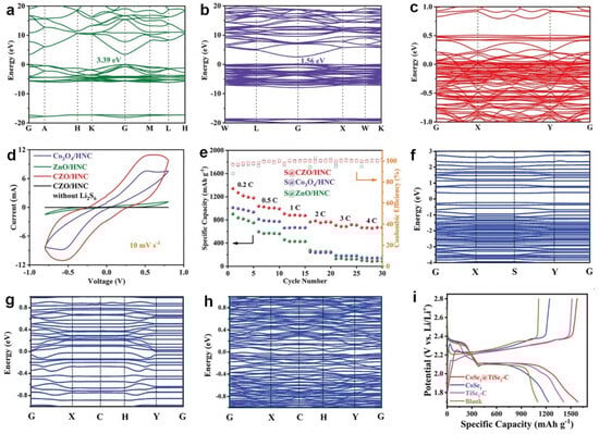 DFT calculations have been used to explain the conductivity increase in catalysts by building heterostructures for Li-S batteries [31,32,33,34,35]. Tang and co-workers constructed Co3O4/ZnO heterojunctions embedded in N-doped carbon nanocages as sulfur hosts (CZO/HNC) [31]. DFT calculations confirmed that Co3O4/ZnO exhibited an optimized band structure with better conductivity. As shown in Figure 1a–c, ZnO and Co3O4 possess broad band gaps of 3.39 and 1.56 eV, respectively, implying semiconducting properties. In contrast, the Co3O4/ZnO heterojunctions revealed a negligible energy band gap, suggesting high conductivity. This result was validated by four-probe resistivity experiments, in which Co3O4/ZnO heterojunctions displayed the highest conductivity of 6.6 × 10−3 S m−1. This heterostructure facilitated ion diffusion and promoted the polysulfide conversion with stable Li-S batteries, which was validated by the experimental results. Cyclic voltammetry (CV) of a symmetric cell (Figure 1d) indicated that CZO/HNC exhibited a stronger current response in contrast to Co3O4/HNC and ZnO/HNC. As a result, sulfur cathodes with CZO/HNC presented the optimized rate capability in comparison with the other two counterparts (Figure 1e).