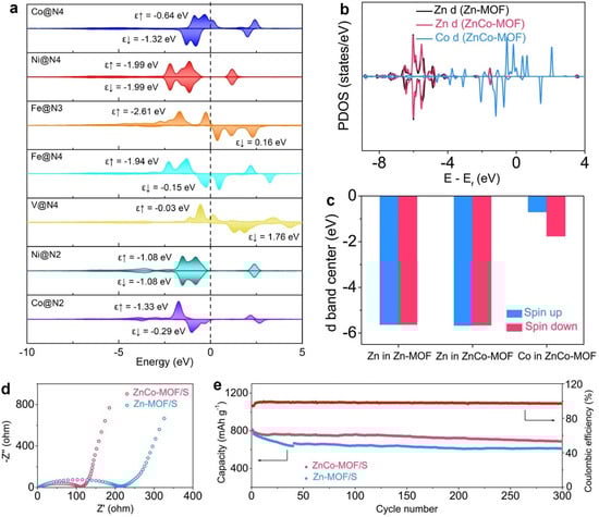 Zhu et al. developed a catalyst composed of bimetallic MOF nanoboxes (ZnCo-MOF NBs) to catalyze sulfur cathodes [46]. To unravel the catalytic conversion of sulfur species at the atomic level, the authors calculated the PDOS of two ZnCo-MOF and Zn-MOF catalysts. As shown in Figure 4b, the Co d states of ZnCo-MOF were significantly close to the Fermi level in contrast to the Zn d states, indicating that the Co d orbitals were dominantly active. The Co active center of ZnCo-MOF was thus responsible for the polysulfide adsorption and catalytic conversion. By comparison, the Zn d states of Zn-MOF were basically located in the same position as that of Zn in ZnCo-MOF. Figure 4c presents the calculated εd of Co and Zn from the two MOF catalysts. The higher Co εd suggests higher catalytic activities than the Zn sites, according to the d-band theory. Due to the enhanced catalytic effects from ZnCo-MOF, sulfur cathodes with ZnCo-MOF (ZnCo-MOF/S) displayed improved interfacial kinetics from the electrochemical impedance spectroscopy (EIS) spectra (Figure 4d). ZnCo-MOF/S, therefore, achieved a reversible capacity of 688 mAh g−1 after 300 cycles at 0.5 C (Figure 4e).