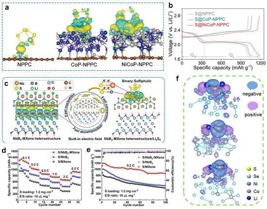 (a) Charge density difference for Li2S6 on NPPC, CoP–NPPC, and NiCoP-NPPC. Yellow and blue suggest the accumulation and depletion of electron charge density, respectively. (b) Voltage profiles of different cathodes. Reproduced with permission [53]. Copyright 2023, Wiley-VCH. (c) Charge density difference in NbB2 and MXene and the adsorption–electrocatalysis mechanism of NbB2-MXene heterostructure. (d) Rate performance and (e) cycling performance of different cathodes. Reproduced with permission [54]. Copyright 2023, Wiley-VCH. (f) Charge density difference of NiSe2, CoSe2, and NiSe2-CoSe2. Reproduced with permission [38]. Copyright 2023, Elsevier.