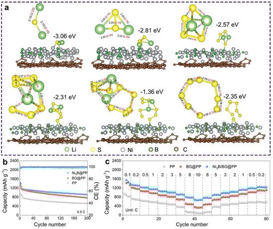 Other metal compounds, like oxides and nitrides [71,72,73], have also shown strong adsorption towards sulfur species, which can effectively mitigate the shuttle effects. For example, Wang et al. designed a core-shelled heterostructure containing Ni3B nanoparticles dispersed on B-doped graphene (Ni3B/BG) to boost the reaction kinetics of Li-S batteries [57]. DFT calculations have determined the adsorption properties of polysulfides. Figure 7a shows various sulfur species’ adsorption energies with optimum structures on Ni3B/BG and BG. Due to the binary interaction, the S atoms of polysulfides were significantly bound with B and Ni. That was in accordance with the XPS results and the adsorption experiment. Ni3B revealed a stronger anchoring ability to polysulfides compared to BG. Polysulfides adsorbed on Ni3B lengthened the bond. This chemical interaction further caused the change in the other bond length. The simultaneous elongation of the S-S and Li-S bonds facilitated the conversion of polysulfides and the Li2S deposition process. Ni3B/BG exhibited superior adsorption towards polysulfides and desirable catalytic effects, enabling sulfur cathodes to have excellent cycling stability. Sulfur cathodes with Ni3B/BG@PP-modified separators maintained a high reversible capacity of 908 mAh g−1 at 0.5 C after 200 cycles (Figure 7b). In addition, Ni3B/BG@PP allowed sulfur cathodes to obtain a high capacity of 650 mAh g−1 even at 10 C (Figure 7c).