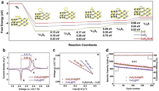Heterostructures integrate the advantages of the individual component to achieve increased catalytic effects on sulfur cathodes. For instance, Meng and co-workers developed a CoS2/ZnS heterostructure that can bidirectionally catalyze sulfur cathodes [33]. As shown in Figure 9a, the rate-determining step was considered to be the Li2S2 reduction to Li2S during discharging due to the highest ΔG. CoS2/ZnS displayed a lower ΔG (0.66 eV) than CoS2 and ZnS, which indicated the thermodynamically favorable Li2S deposition by CoS2/ZnS. Accordingly, the facilitated process was confirmed with CV and Tafel analyses. Sulfur cathodes with CoS2/ZnS-modified PP separators (CoS2/ZnS@PP) displayed a lower voltage difference between the cathodic Peak B and anodic Peak C than that with CoS2@PP (Figure 9b). This result indicated that CoS2/ZnS decreased the polarization effect of sulfur cathodes. Furthermore, the Tafel slope calculated from Peak B in Figure 9c suggested that CoS2/ZnS mitigated the overpotential of the Li2S deposition process due to the smaller Tafel slope. Benefiting from the merits of heterostructure, CoS2/ZnS@PP achieved prolonged cycling stability for 200 cycles (Figure 9d).