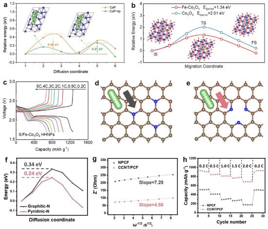(a) The relative energy of lithium-ion diffusion on CoP and CoP-Vp. Reproduced with permission [98]. Copyright 2022, Wiley-VCH. (b) Li+ diffusion on Fe-Co3O4 and Co3O4 and the corresponding geometrical structures. (c) Voltage profiles of sulfur cathodes at various C rates. Reproduced with permission [50]. Copyright 2023, Wiley-VCH. Li-ion diffusion pathways in (d) graphitic-N and (e) pyridinic-N. (f) Calculated energy barriers of the lithium-ion diffusion. (g) Slope fitting showing the relation between ω−1/2 and Z′ from EIS. (h) Rate capability of different cathodes. Reproduced with permission [65]. Copyright 2023, Elsevier.